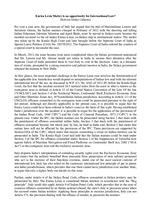 Pdf Enrica Lexie Matter Is An Opportunity For International Law