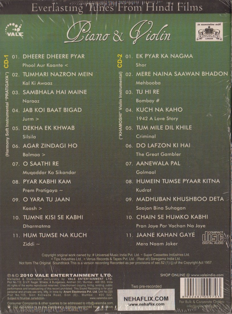 Various Classic Piano Violin Hindi Tunes Instrumental 2 Cd