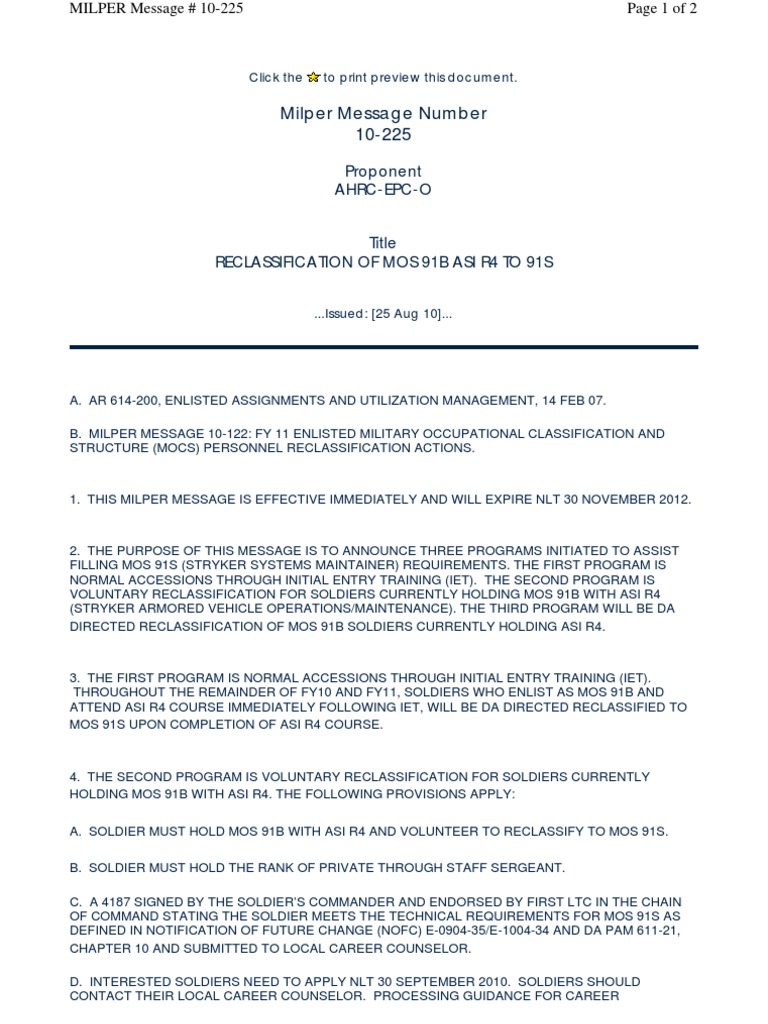 Reclassification Of Mos 91b Asi R4 To 91s Milper Message10 225 Military Of The United States National Security