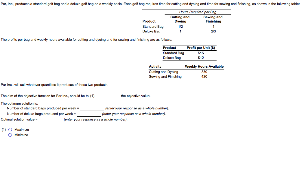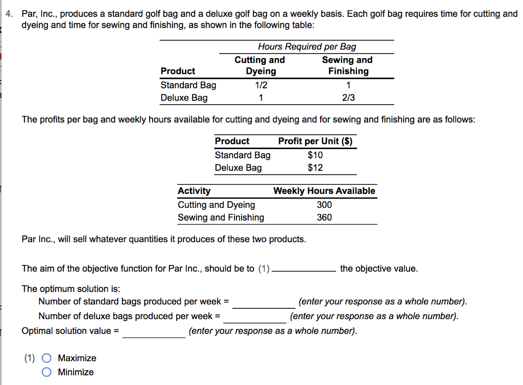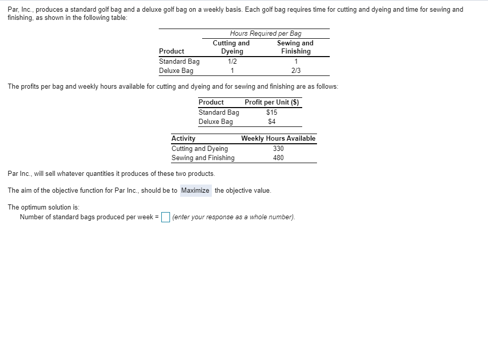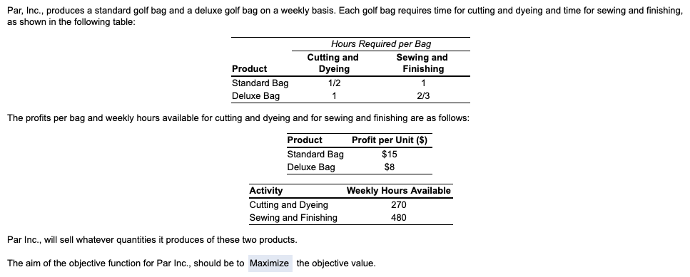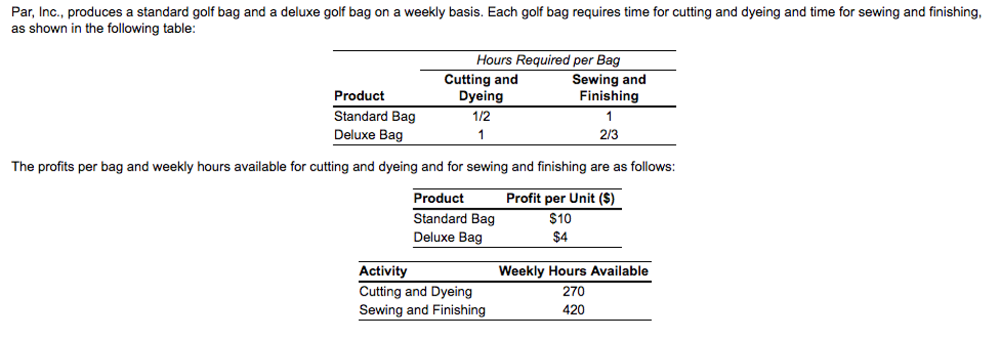 Solved Par Inc Produces A Standard Golf Bag And A Deluxe
