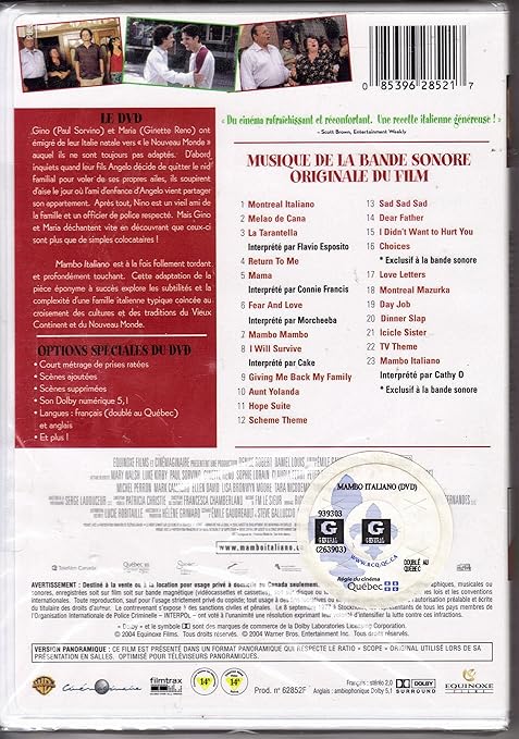 Mambo Italiano English French 2004 Widescreen Double Au Quebec Dvd