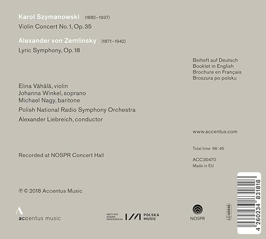 Polish National Radio Symphony Orchestra Elina Vahala Johanna Winkel Michael Nagy Karol Szymanowski Alexander Zemlinsky Alexander Liebreich Violin Concerto 1 Lyric Symphony Amazon Com Music