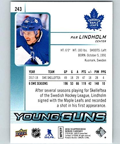 2018 19 Upper Deck Series 1 Young Guns Yg Rc 243 Par Lindholm