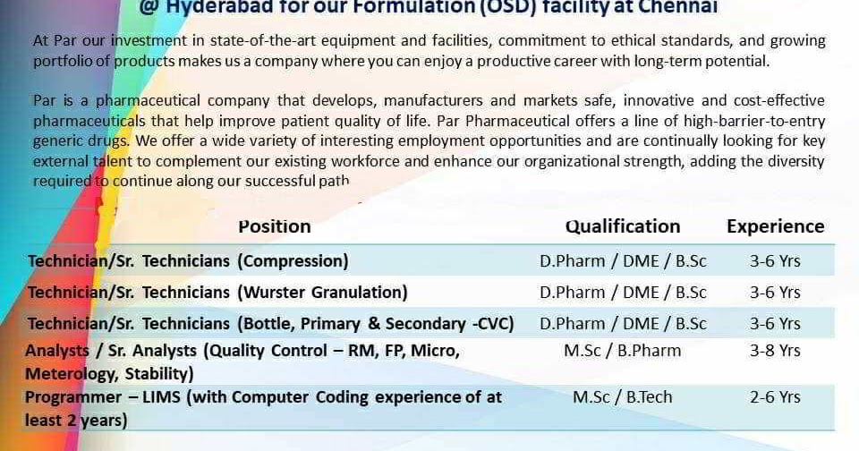Par Pharmaceutical Ltd Urgent Openings For B Pharm M Pharm Ph D
