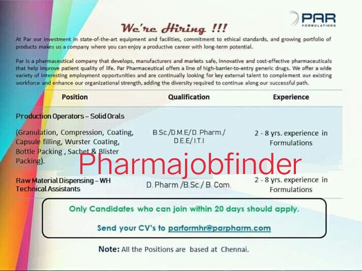 Jobs In Par Formulations Pvt Ltd Vacancies In Par Formulations