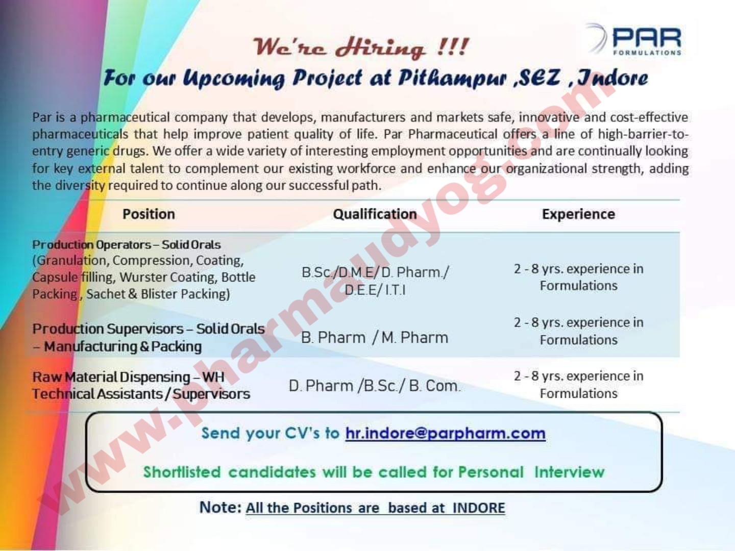 Par Formulations Hiring For Pitampur New Plant Indore Send Cv