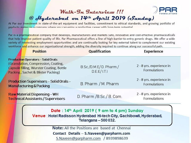 Par Formulations Walk In Interview Hyderabad On 25th August