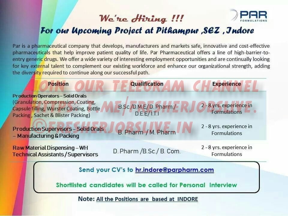 Par Formulations Hiring For Pitampur New Plant Indore Send Cv