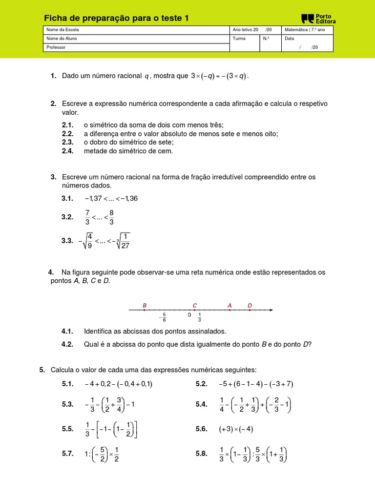 Ficha De Preparacao Para O Teste De Matematica 7º Ano Numeros
